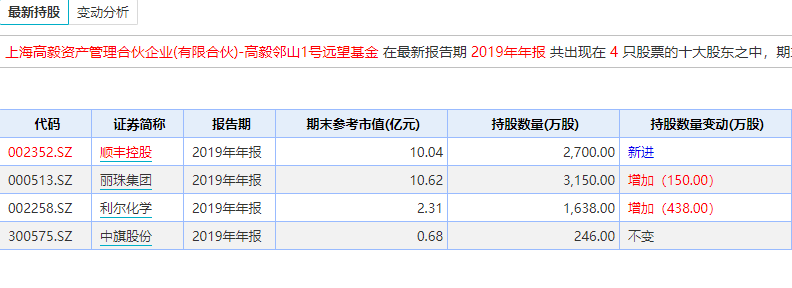 高毅资产冯柳管理的高毅邻山1号远望基金,在最新报告期 2019年年报 共出现在顺丰控股、丽珠集团、利尔化学、中期股份 4 只股票的十大股东之中,期末参考市值合计为 23.65 亿元。