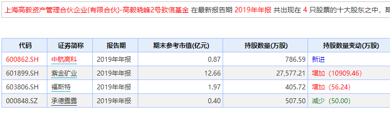 高毅资产的邓晓峰则买入中航高科、同时大举买入紫金矿业,增持福斯特、减持承德露露。