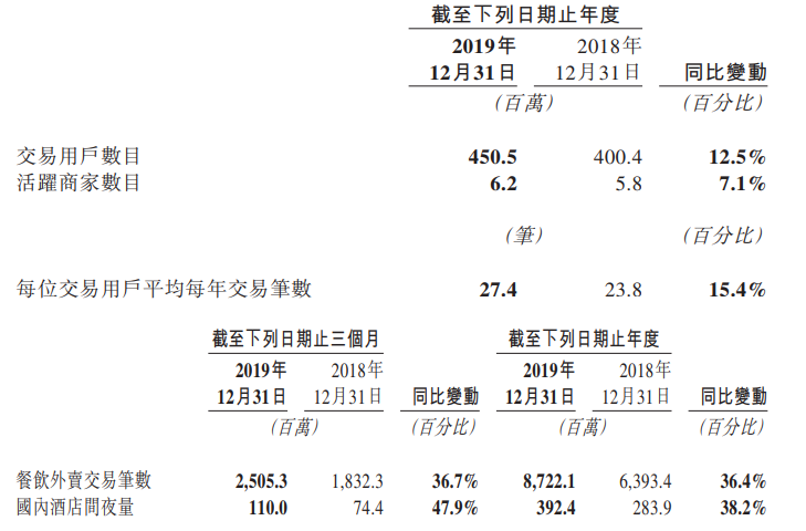 截至2019年年末,美团点评交易用户数目为4.505亿,同比增长12.5%,活跃商家数目620万,同比增长7.1%;每位交易用户平均每年交易笔数为27.4笔,同比增长15.4%。2019年餐饮外卖交易笔数达到87.221亿,同比增长36.4%,酒店间数达到3.924亿,同比增长38.2%。