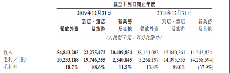 在业务收入方面,餐饮外卖收入548.43亿元,占总收入56.2%,毛利率为18.7%;到店、酒店及旅游收入222.75亿,占总收入22.8%,毛利率为88.6%。