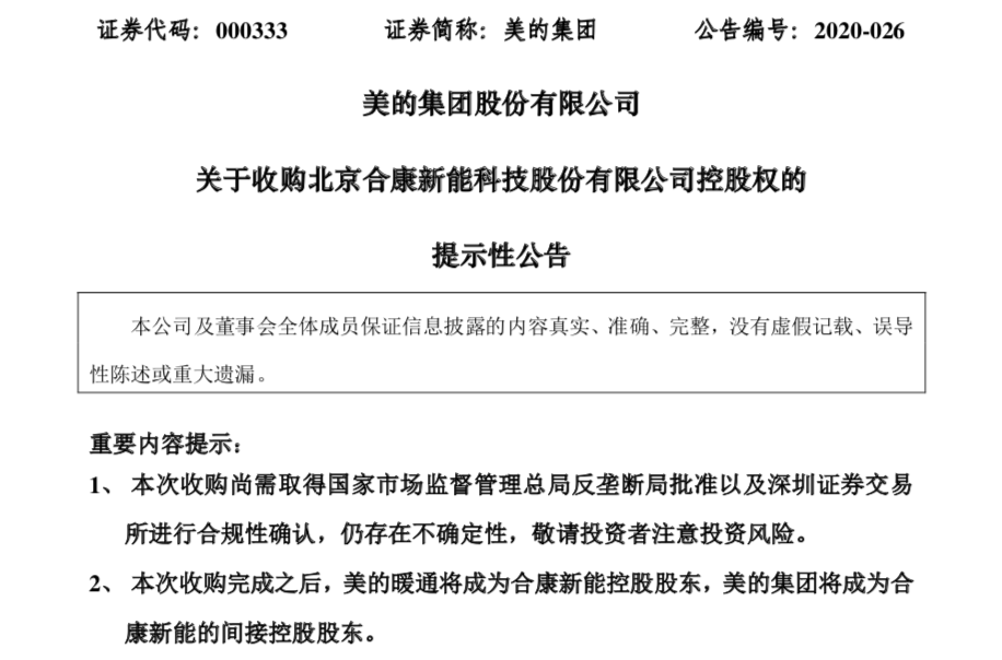 近日,美的发布公告表示,公司拟通过下属子公司广东美的暖通设备有限公司(“美的暖通”)以协议方式收购北京合康新能科技股份有限公司(“合康新能”)控股权,收购总价款为7.4亿元。本次交易之后,美的暖通将拥有合康新能23.73%的表决权成为公司控股股东,美的集团间接成为控股股东。