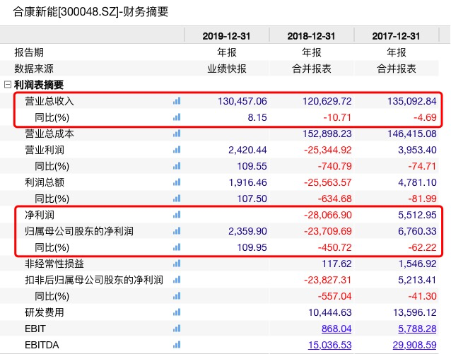 纵观合康新能上市以来的财务状况问题重重,2017年收入与净利大幅下滑,2018年出现巨额亏损。财报显示,2018年实现营收12.06亿元,同比下滑10.71%;归属于上市公司股东的净利润亏损2.37亿元,同比下滑450.72%。对此,合康新能表示业绩下滑系北京华泰润达节能科技有限公司业绩下滑,公司对收购北京华泰润达节能科技有限公司100%股权所形成的商誉计提减值,导致2018年报告期净利润亏损。