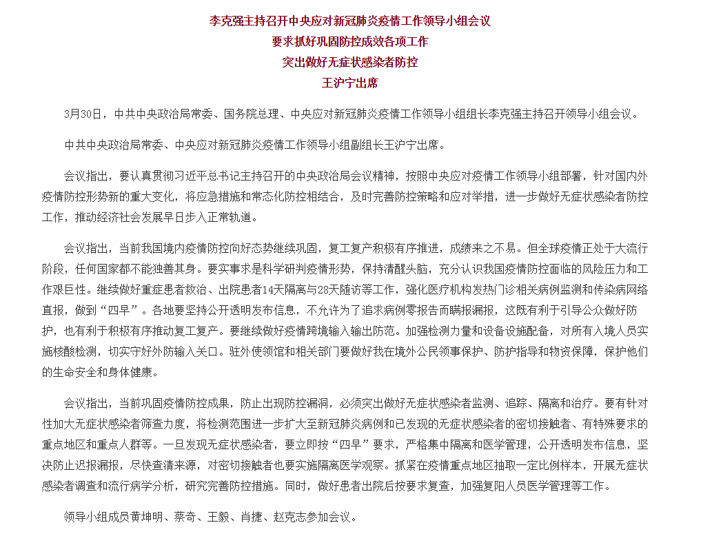 中央应对新冠肺炎疫情工作领导小组召开会议。会议指出,当前巩固疫情防控成果,防止出现防控漏洞,要突出做好无症状感染者监测隔离和治疗,有针对性加大筛查力度,将检测范围扩大至已发现病例和无症状感染者的密切接触者、重点地区和人群等。一旦发现无症状感染者,要立即按“四早”要求,严格集中隔离和医学管理,公开透明发布信息,尽快查清来源,对密切接触者也要实施隔离医学观察。抓紧在疫情重点地区抽取一定比例样本,开展无症状感染者调查和流行病学分析研究,完善防控措施。