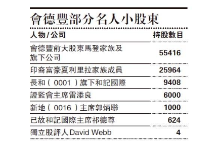 事实上,作为老牌港股,会德丰拥有不少名人小股东,但股数普遍不多。包括已故和记国际主席祁德尊、前会德丰大股东马登家族、新地主席兼董事总经理郭炳联,独立股评人David Webb等,持股数量从1000万股至数万股不等。