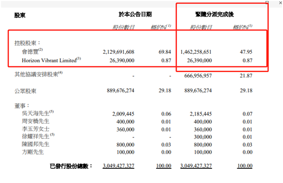 同理,根据九龙仓集团公告,在私有化之前,吴光正通过会德丰及Horizon Vibrant Limited间接持有九龙仓集团69.56%*69.84%+0.87%*0.471=48.99%股权,私有化之后吴光正直接持有48.82%股权,持股比例只减少了0.63%。