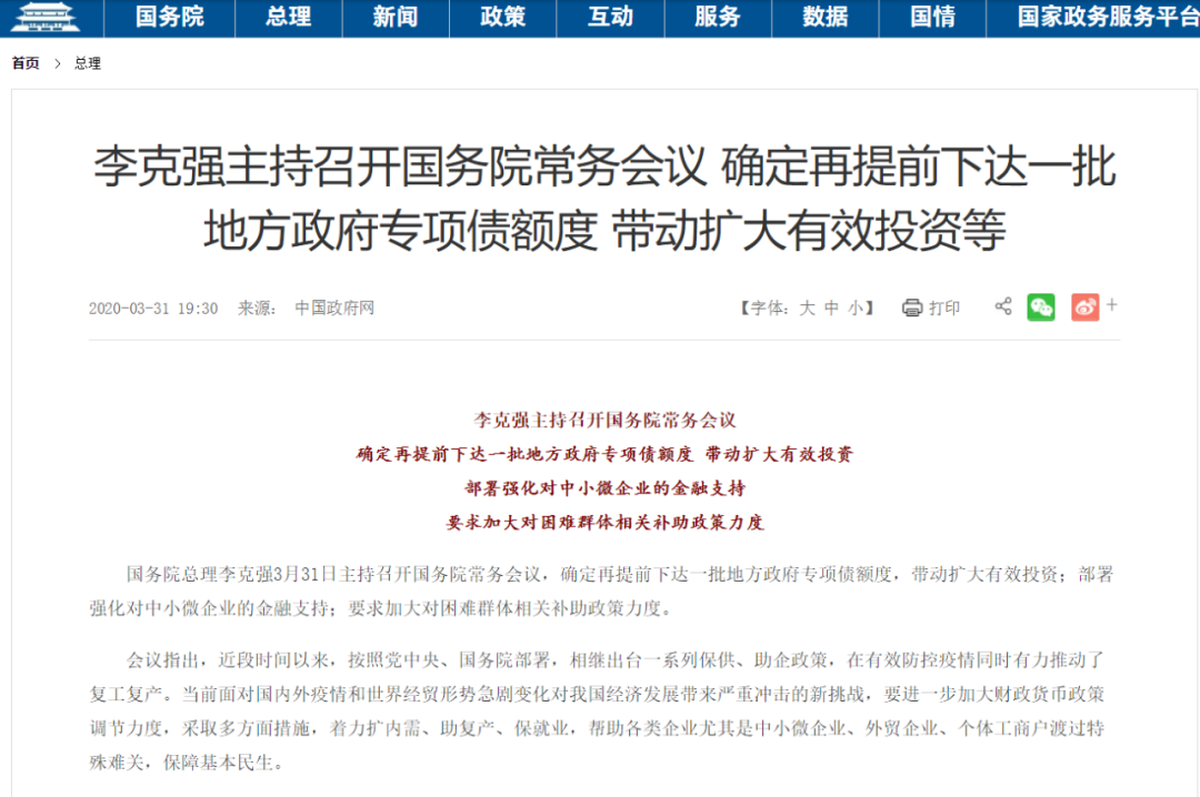 据央视新闻,国务院总理李克强3月31日主持召开国务院常务会议,确定再提前下达一批地方政府专项债额度,带动扩大有效投资;部署强化对中小微企业的金融支持;要求加大对困难群体相关补助政策力度。