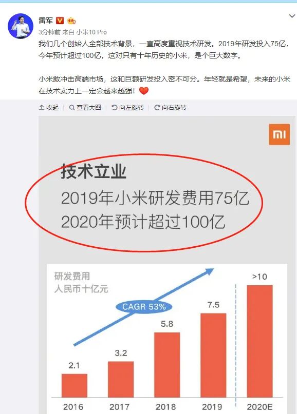 根据小米创办人雷军微博,预计2020年研发投入超100亿元。