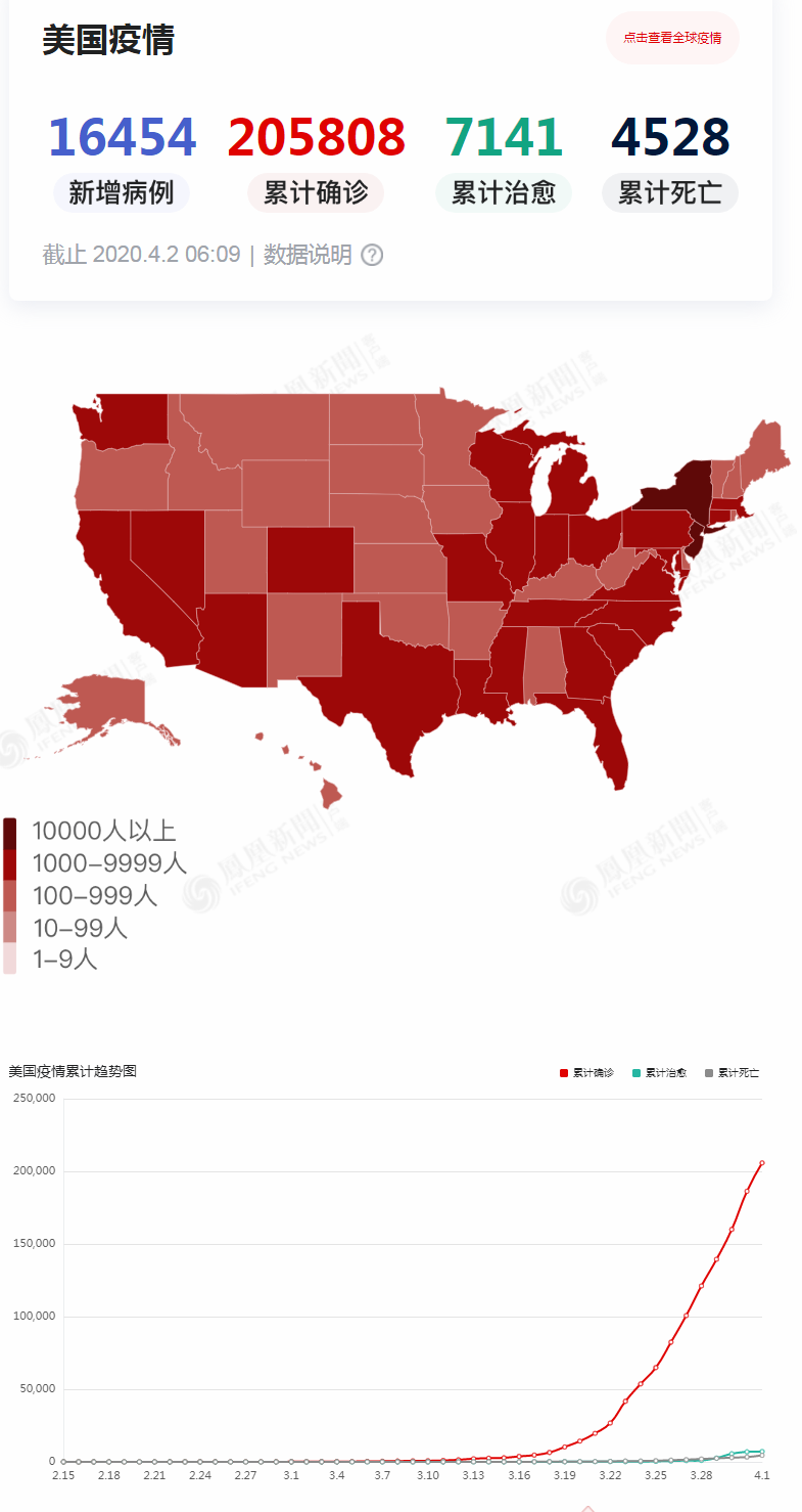 截至北京时间4月2日凌晨2点20分(当地时间1日下午14点20分),美国全境共报告205808名新冠肺炎确诊病例,其中至少4528名患者死亡。