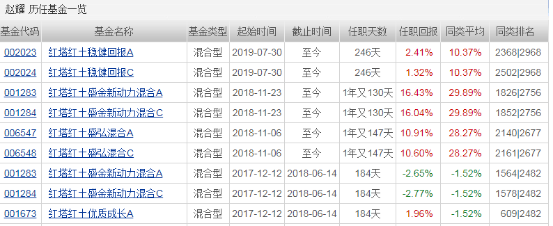 虽然担任基金经理的时机如此巧妙,赵耀管理的红塔红土盛弘混合C基金从2018年11月之今的任职回报率也仅为10.60%,而同行的平均收益率为28.27%,业绩排名在2677只同类基金中排名2161名。
