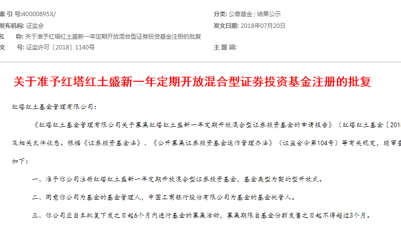 另根据证监会网站披露的信息显示,红塔红土盛新一年定开基金早在2018年7月下旬就已获批,为偏债混合型产品,股票资产占基金资产的比例为0%—30%。根据《基金法》规定,基金管理人应当自收到核准文件之日起6个月内进行基金募集。超过6个月开始募集,原核准的事项未发生实质性变化的,应当报国务院证券监督管理机构备案;发生实质性变化的,应当向国务院证券监督管理机构重新提交申请。