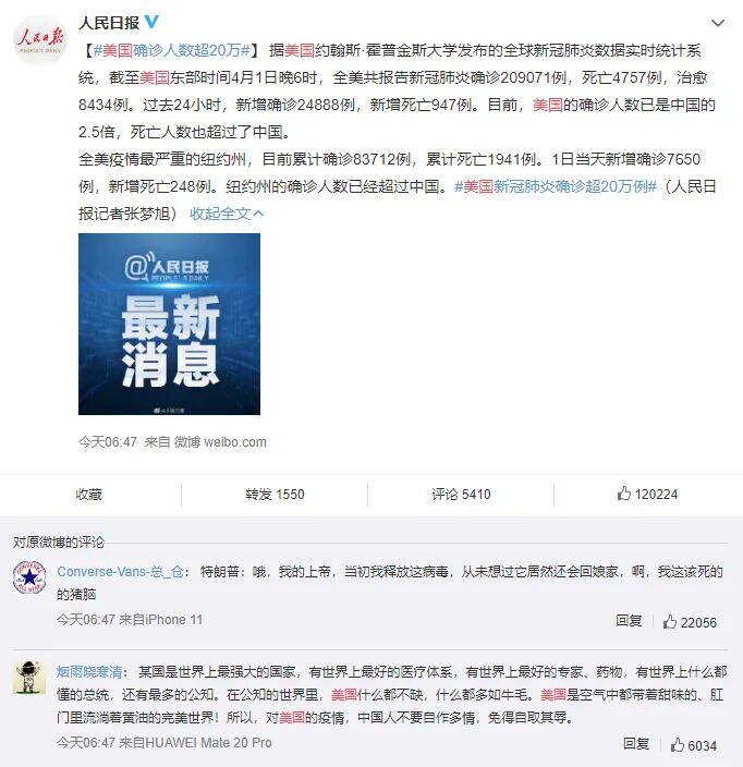 人民日报微博,据美国约翰斯·霍普金斯大学发布的全球新冠肺炎数据实时统计系统,截至美国东部时间4月1日晚6时,全美共报告新冠肺炎确诊209071例,死亡4757例,治愈8434例。过去24小时,新增确诊24888例,新增死亡947例。目前,美国的确诊人数已是中国的2.5倍,死亡人数也超过了中国。