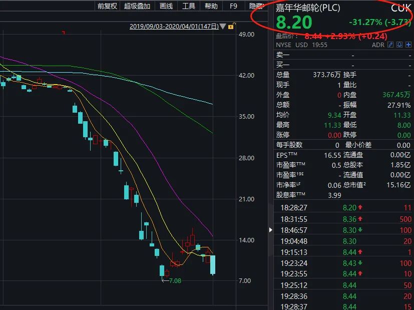 昨日晚间,美股全线收跌,道指跌近1000点,跌去973.65点,跌幅4.44%。美股邮轮股、航空股集体下跌,嘉年华邮轮跌超31%,皇家加勒比邮轮跌超19%;美国三大航空股也暴跌,美联航跌逾18%,达美航空跌逾16%,美国航空跌逾12%;波音也跌逾12%。