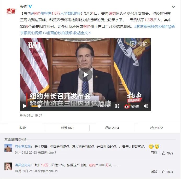 3月31日,美国纽约州长科莫召开发布会,称疫情将在三周内到达顶峰。科莫表示病毒检测能力接近新的历史纪录水平,一天测试了1.8万多人,其中9298个都是阳性病例。此外科莫还透露纽约州正在自主开发抗体测试。