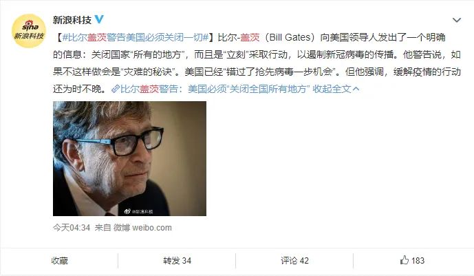 微软创始人比尔·盖茨呼吁,敦促(美国)政府在全国范围内采取统一的关闭措施。