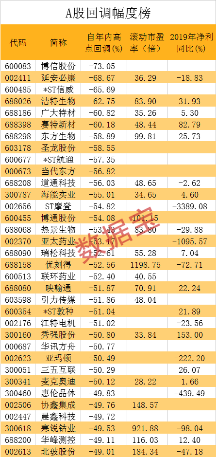 A股回调榜出炉,最多跌超70%