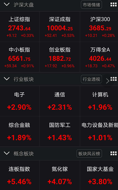 隔夜欧美股市集体重挫,美股三大股指收盘均跌超4%。今天早盘A股表现相对抗跌,上证指数小幅上涨0.33%,创业板指上涨0.96%。科技股表现出色,电子、通信、计算机早盘领涨市场,其中电子板块大涨2.9%。