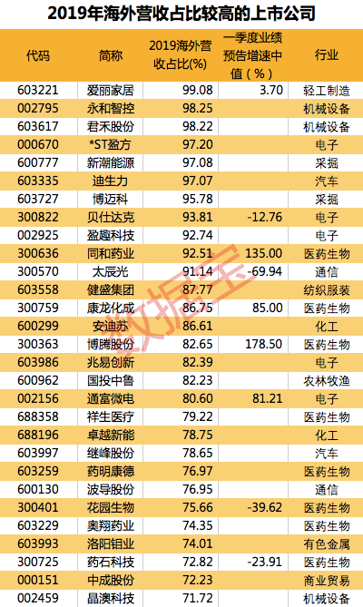 从上市公司维度来看,2018年沪深两市上市公司海外业务收入占总营业收入的比重为9.8%。商业贸易、交通运输、电子、家用电器和休闲服务业上市公司海外收入占营收比重超过三分之一。在2019年已发布了年报的近八百家上市公司中,对海外业务依存度超过70%的公司有29家,主要分布于机械设备、电子、医药生物行业。