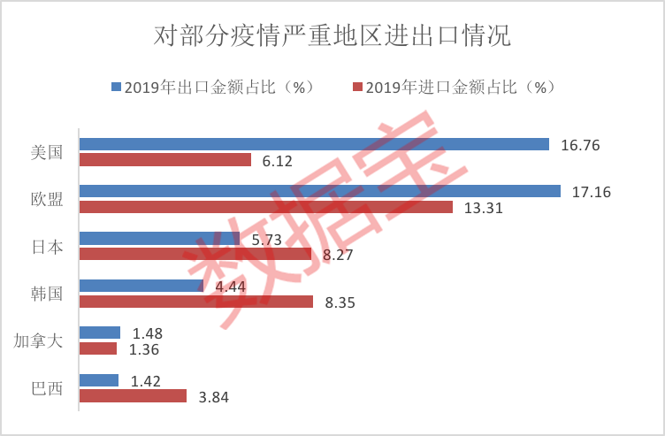 其中,中国汽车及其零部件的进口中,美、德、意合计占比40%;机械设备及其零部件的进口中,美、德、意、法、英的进口占比为40%;发动机类产品进口中,美、德、英、法、意五国占比合计为75%;航空航天及其零件产品进口中,美国、法国两国占比83%;医药、医疗器械进口中,美、德、法、意占比总和达到56%。当前上述国家的生产过程均受到疫情的影响,下游中国企业面临的供应链风险凸现。