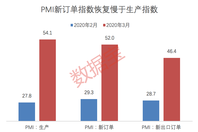3月我国制造业PMI生产指数从上月的27.8回升至54.1,新订单指数从上月的29.3回升至52,生产端复苏的表现好于需求端。新出口订单指数从28.7回升至46.4,受海外疫情影响进出口指数均处于荣枯线之下。部分行业的需求恢复更为缓慢。
