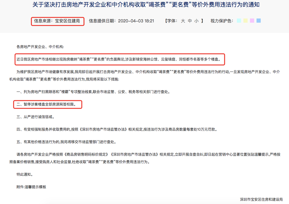 4月3日,深圳市宝安区住房和建设局发布《关于坚决打击房地产开发企业和中介机构收取“喝茶费”“更名费”等价外费用违法行为的通知》称,近日,宝安区房地产市场相继出现购房缴纳“喝茶费”“更名费”的负面舆论,涉及新锦安海纳公馆、云玺锦庭、润恒都市名荟等多个楼盘。