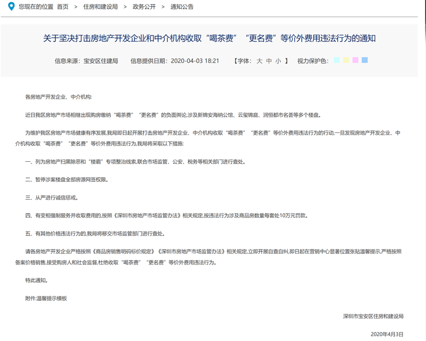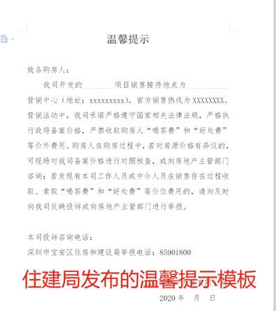 除此之外,宝安区住建局还要求各房地产开发企业严格按照《商品房销售明码标价规定》《深圳市房地产市场监管办法》相关规定,立即开展自查自纠,即日起在营销中心显著位置张贴温馨提示,严格按照备案价格销售,接受购房人和社会监督,杜绝收取“喝茶费”“更名费”等价外费用违法行为。