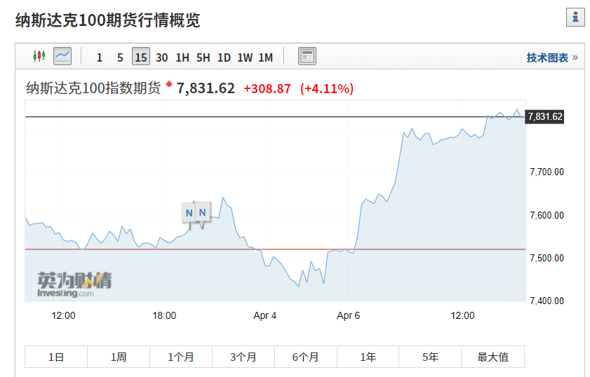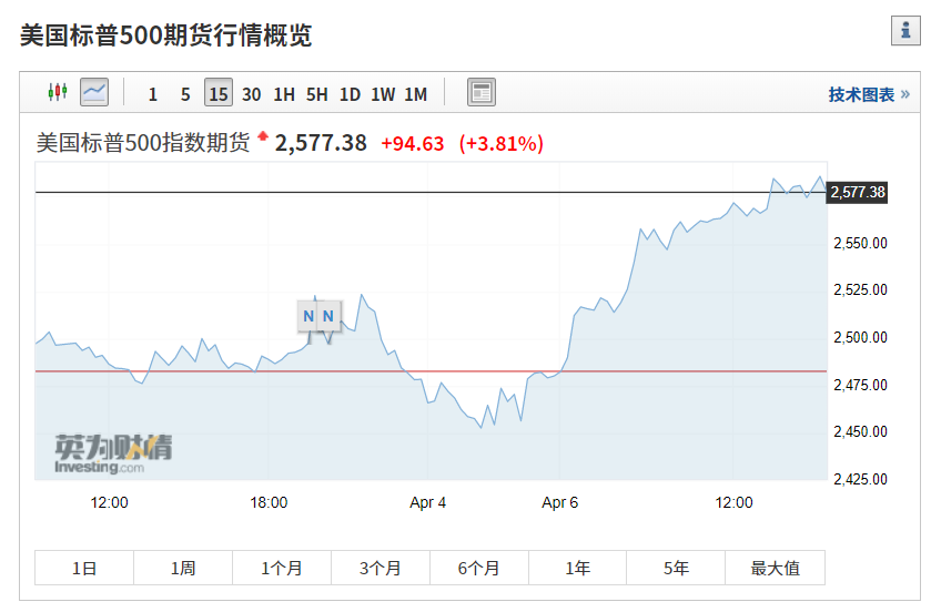 截至发稿,标准普尔500指数期货上找3.81%,盘中一度上涨超4%。