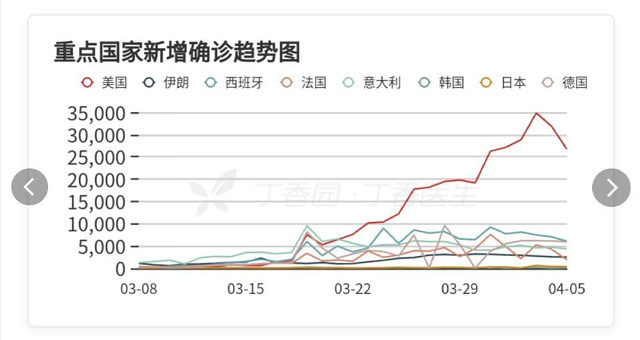 根据丁香医生的重点国家新增确诊趋势图显示,在经历4日单日暴增10万例之后,美国、意大利、法国和西班牙等重点疫情国家的新增病例均有所下降。