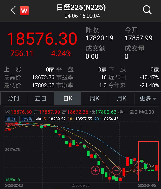 虽然日本有可能在周二宣布进入紧急状态,但是在全球疫情趋缓的情况下,日经指数缩量盘整数日后,今日反弹4.24%,股市出现企稳现象。