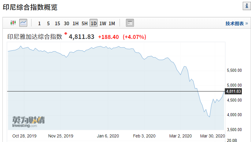 6日,印尼雅加达综合指数上涨4.07%,较3月24日的低点上涨超过20%。