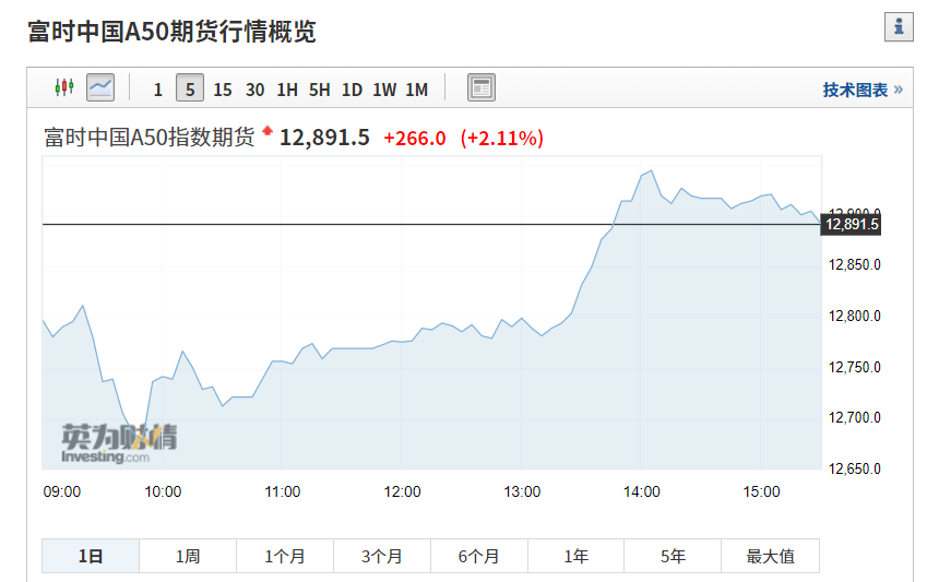不仅美国三大期指上涨,富时中国A50期指也在早盘小幅下挫之后,持续拉升。截至发稿,富时中国A50期指上涨2.11%,盘中一度涨超300点。