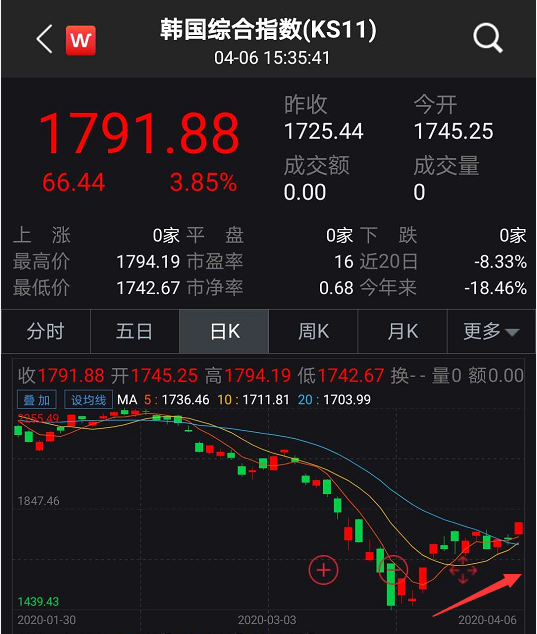 韩国KOSPI指数上涨3.85%,较3月19日低点涨23%。