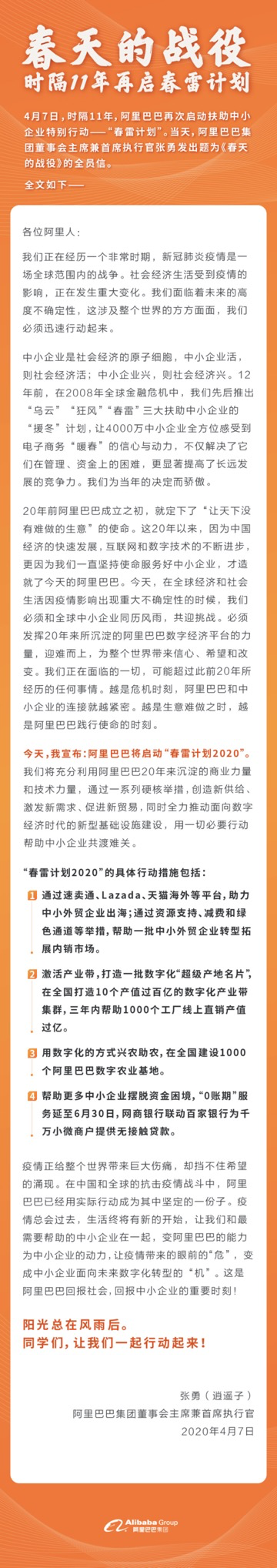 当天,阿里巴巴集团董事会主席兼首席执行官张勇发出一封题为《春天的战役》的全员信,信中说:“作为社会经济的原子细胞,中小企业活,则社会经济活;中小企业兴,则社会经济兴。”