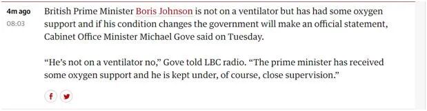 “他没用呼吸机,没有,”戈夫告诉伦敦广播公司(LBC),“首相得到了一些供氧支持,当然,他一直受到密切观察。”