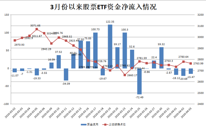 自从今年3月5日沪指创下3074点高点后,近一月指数震荡下行。截至清明节前的4月3日,近一月沪指下跌近10%,而场内资金却借道股票ETF越跌越买。截至4月3日,近一月净流入资金557.12亿元,这一数据也逼近2018年四季度净流入的资金体量。