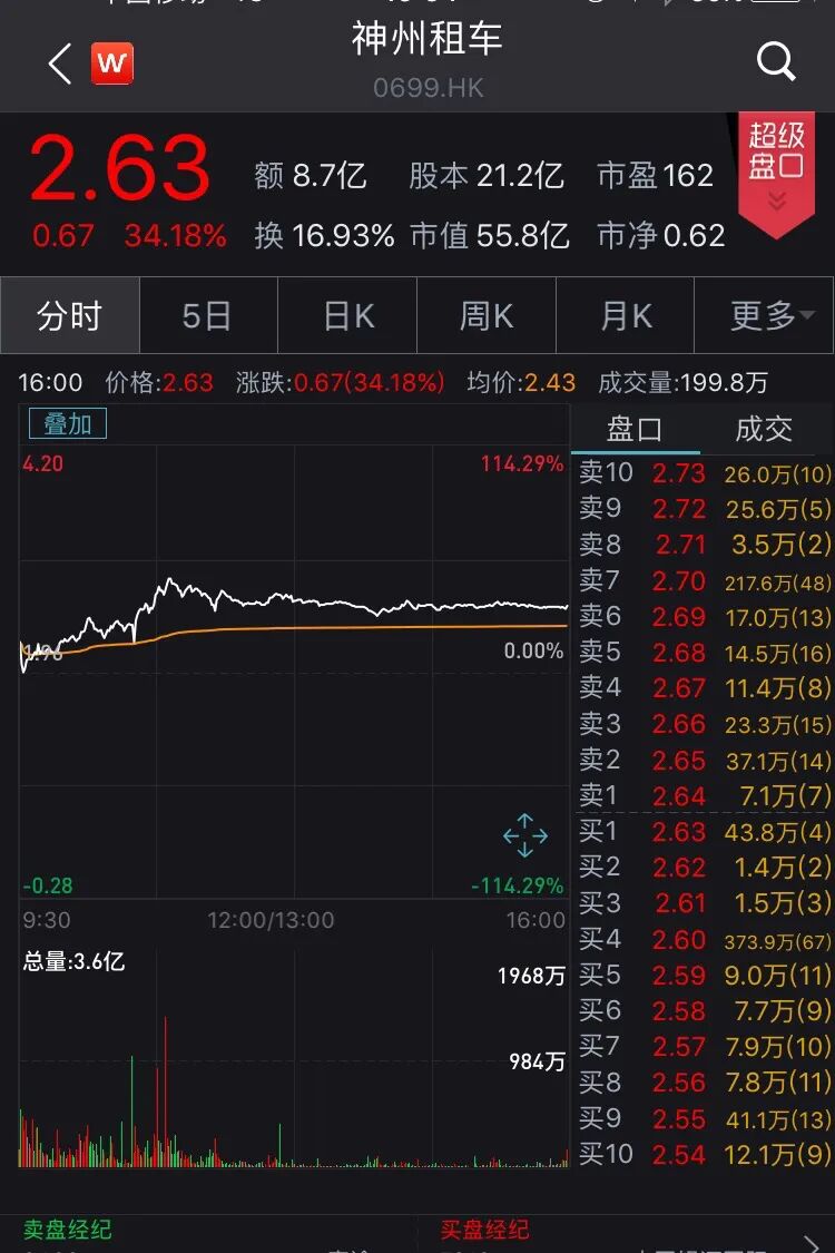 起早发公告效果显著。今日开盘,神州租车涨超15%,此后一路上扬,盘中最高涨幅超过48%,市值暴涨20亿港币。下午股价有所回落,截至今天港股收盘,神州租车股价较上一交易日上涨34.18%,报2.63港元/股,总市值55.76亿港元。