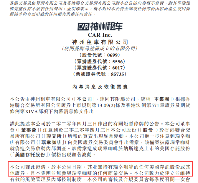 神州租车发布关于内幕消息及恢复买卖的公告,表示公司并未持有瑞幸咖啡的股份或其它证券,也并未参与瑞幸咖啡的任何商业交易。