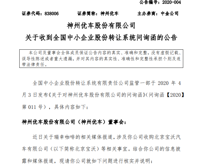 4月7日晚,神州优车公告称,4月3日,全国股转公司向神州优车火速下发超2000字的问询函,问题涉及五大方面,包括瑞幸事件对挂牌公司的影响、挂牌公司收购北京宝沃股权的相关细节等。