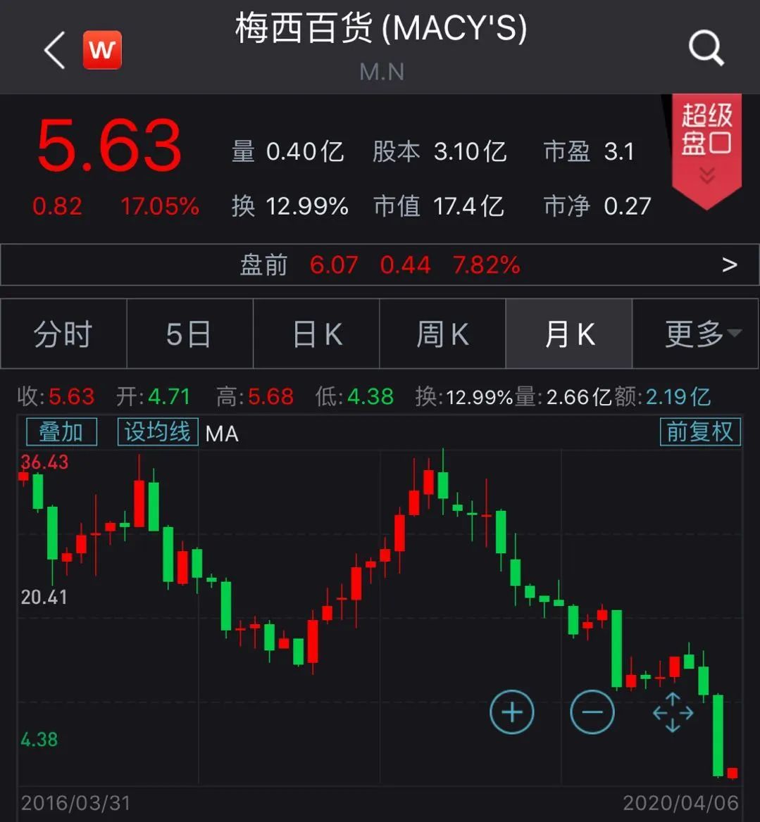2020年以来,梅西百货的股价节节坠落,截至当地时间4月6日,其股价盘中最低跌至4.38美元/股,最大下跌幅度超过70%。截至盘后,尽管大涨17%,但年内跌幅仍超66%,总市值仅剩17.43亿美元。