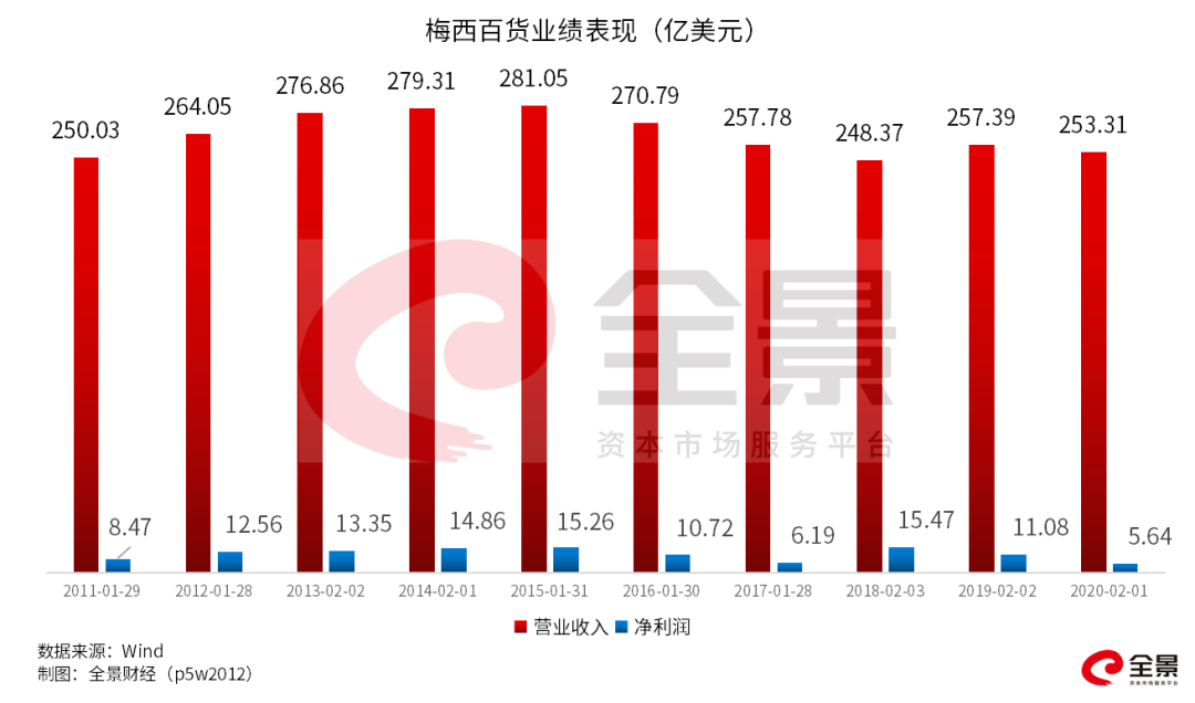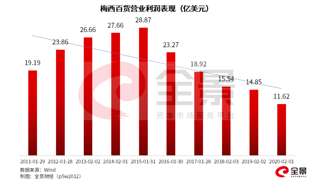2019年,梅西百货的营业利润为11.62亿美元,较2015年的23.27亿美元腰斩。同期净利润同比下滑49%至5.64亿美元。