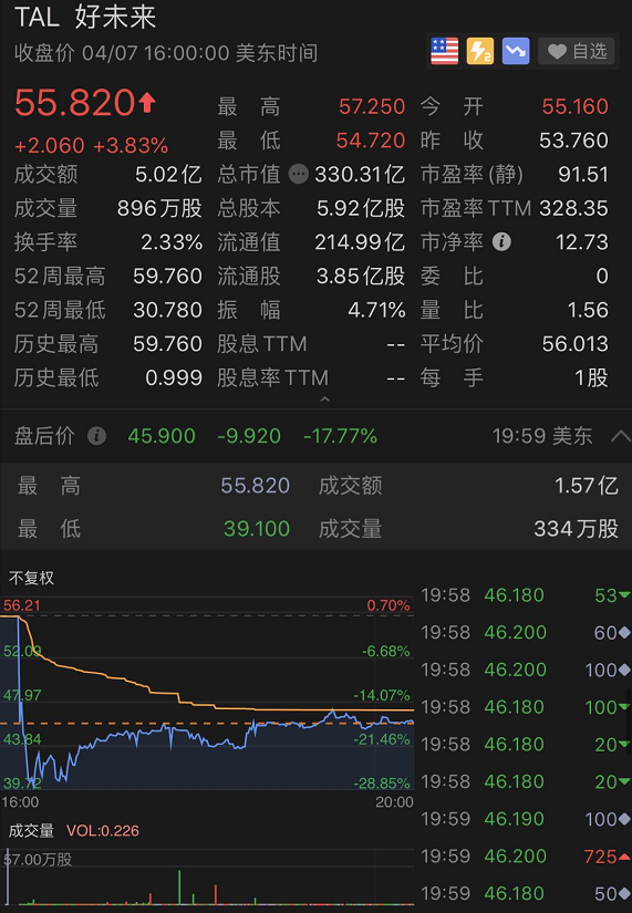 消息一出,好未来盘后股价一度跌近30%。目前盘后下跌17.77%,报45.9美元。
