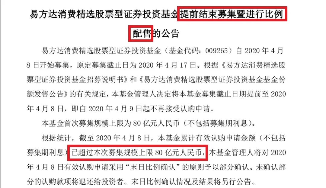 易方达官网刚刚也挂出易方达消费精选提前结束募集暨进行比例配售的公告。公告中称,根据统计,截至2020年4月8 日,该基金累计有效认购申请金额(不包括募集期利息)已超过募集规模上限 80亿元人民币,基金管理人将对 2020年4月8日有效认购申请采用“末日比例确认”的原则予以部分确认。
