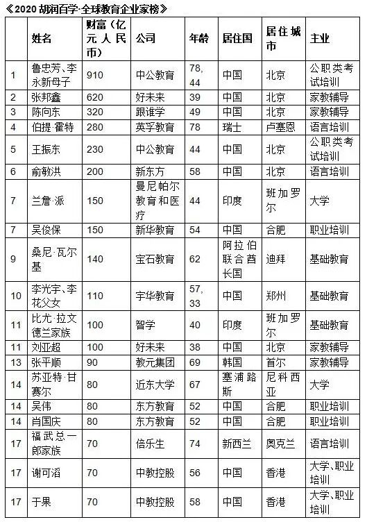 近日,胡润研究院联合国际教育平台胡润百学发布《2020胡润百学·全球教育企业家榜》。榜单统计了截止2020年3月20日,全球教育领域财富达十亿美金的19位企业家。