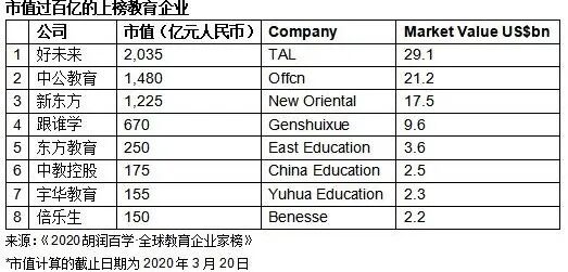 而该榜单发布之际的3月30日,好未来以市值2035亿元高居上榜的8家上市教育公司首位,中公教育、新东方分别以1480亿、1225亿位居第二、三位。