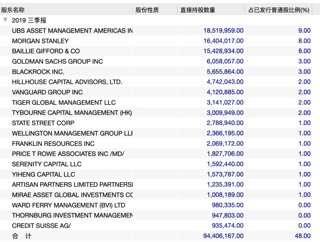 从投资者结构来看,截至2019年三季度末,前20名机构股东合计持有好未来9440.62万股,持股占比达48%。
