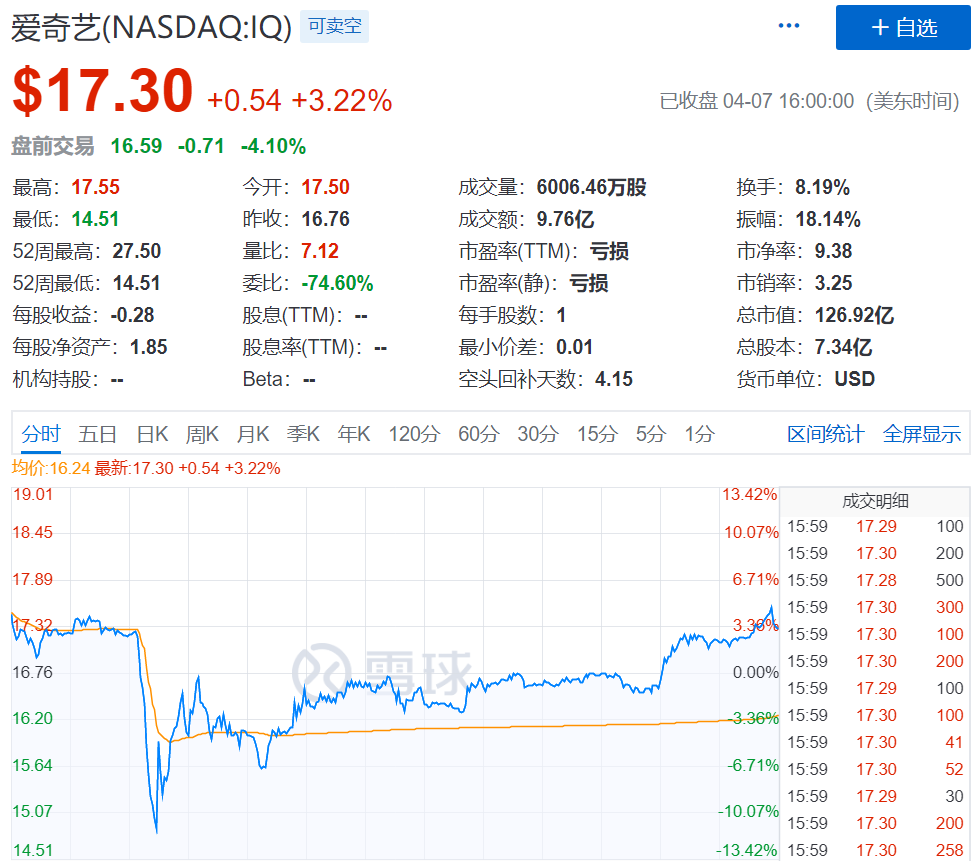 沽空报告发布后,爱奇艺强势回应,作为一个负责任的上市公司,披露的所有财务和运营数据均是真实的。随后,股价强势反弹,将盘中跌幅全数收回,并上涨3.2%。