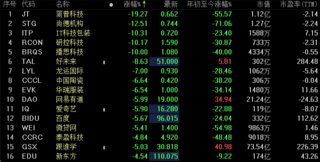 好未来“自曝”员工造假后,在美上市的教育企业亦出现暴跌。其中,尚德机构、跟谁学、新东方均出现大跌。