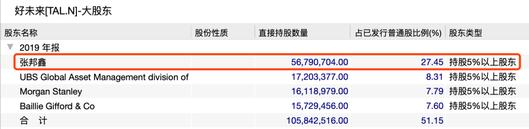 据公开资料显示,好未来创始人为39岁的张邦鑫。截至2019年年报,张邦鑫直接持有好未来5679万股股票,持股占比27.45%,为好未来的第一大股东。
