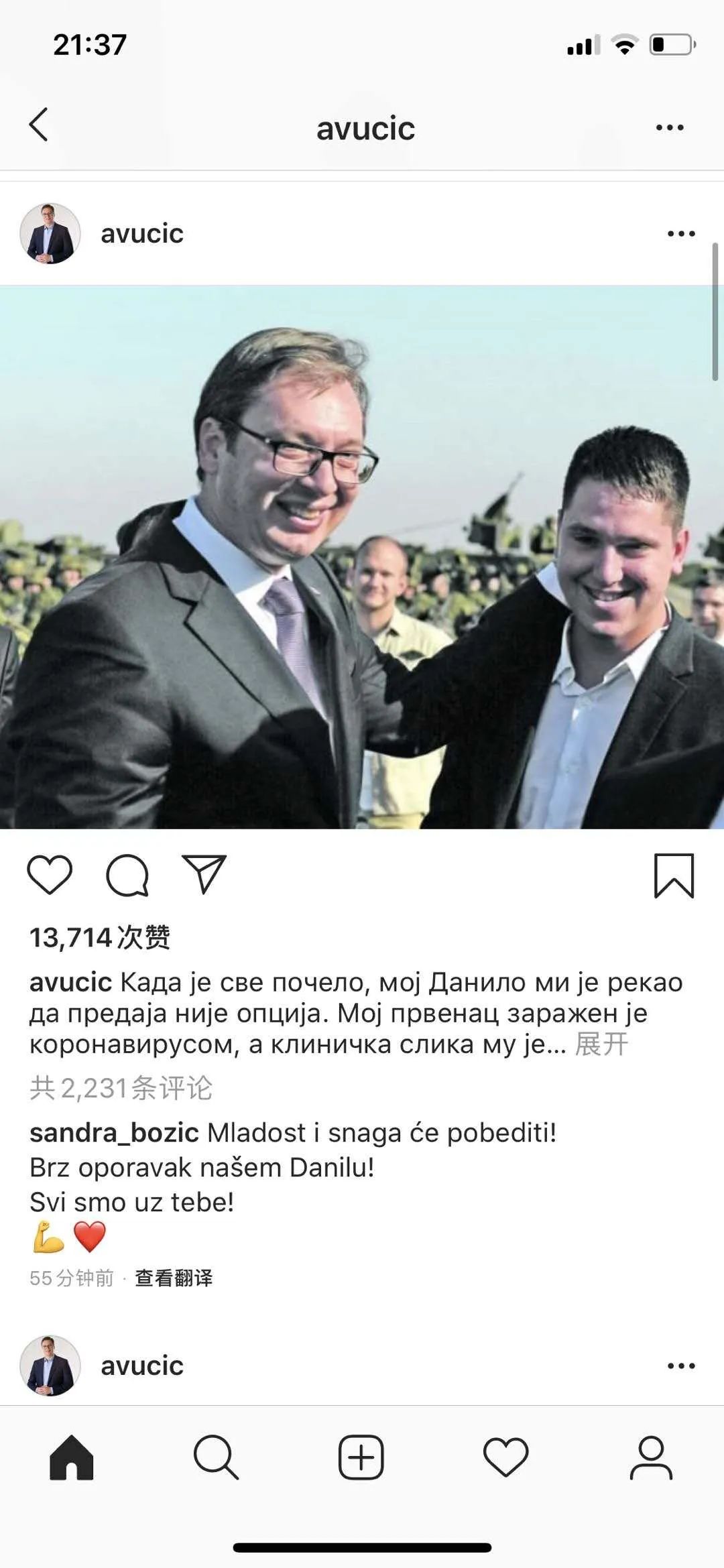 当地时间8日晚,塞尔维亚总统武契奇在社交媒体上发布消息称,儿子达尼洛新冠病毒检测呈阳性。武契奇写道:“儿子,你会赢的!爸爸爱你!我们都爱你!”