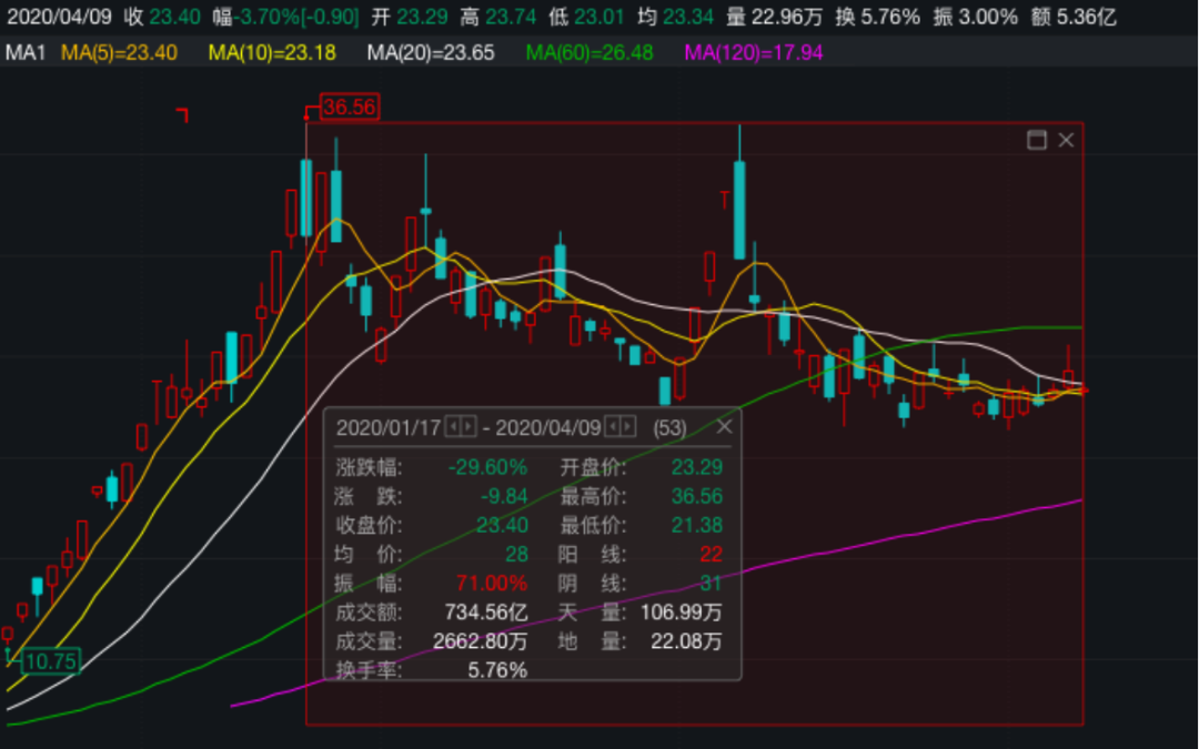 今日,星期六低开低走,开盘跌逾3%,且盘中一度跌至5.31%,截至发稿报23.47元/股,跌3.42%,最新总市值为173亿元,交易总额6.64亿元。