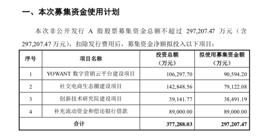 近日,女鞋龙头转型“网红新零售”的星期六发布定增预案,预计非公开发行A股股票募集资金总额不超过29.7亿元,扣除发行费用后,募集资金净额拟用于YOWANT数字营销云平台建设项目、社交电商生态圈建设项目、创新技术研究院建设项目,并补充流动资金和偿还银行借款,项目计划建设周期为2年。同时,星期六表示若本次实际募集资金净额(扣除发行费用后)少于项目拟投入募集资金总额,募集资金不足部分由公司自筹解决。